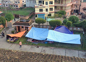 Le jour du premier séisme, le Centre pour la paix de la SGI-Népal à Katmandou a ouvert ses portes à environ 600 personnes dans le besoin, et a fourni abris, masques médicaux et premiers soins. Le centre a continué d'accueillir les personnes déplacées par la catastrophe pendant plus d'un mois, utilisant des bâches en plastique pour abriter les personnes dans le parc du centre.
